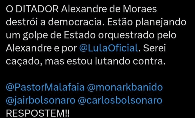 “O perfil da Câmara dos Deputados no Twitter publicou o seguinte post: O DITADOR Alexandre de Moraes destrói a democracia. Estão planejando um golpe de Estado orquestrado pelo Alexandre e por @LulaOficial. Serei caçado, mas estou lutando contra”, afirmou a postagem.