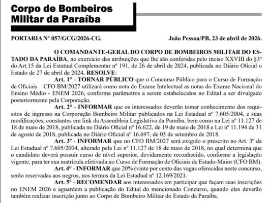 Foi publicada no Diário Oficial do Estado da Paraíba desta sexta-feira (24), a Portaria nº 057/GCG/2026-CG que torna público que o Concurso para o Curso de Formação de Oficiais Bombeiro Militar – CFO BM 2027 utilizará as notas do ENEM 2026 como etapa do Exame Intelectual.
