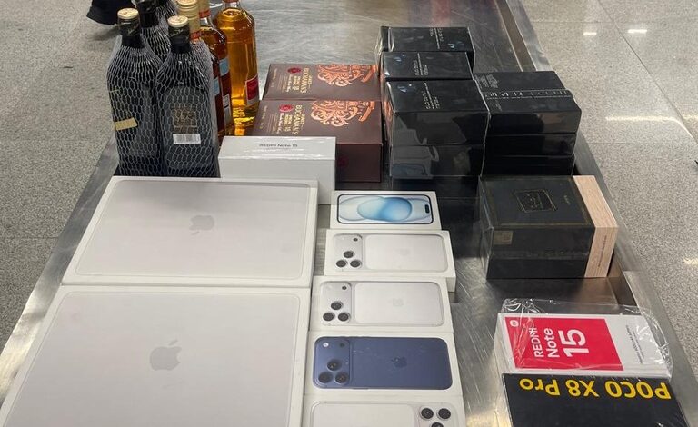 Entre eles, IPhones de última geração, iPads, smartphones, whiskies, cosméticos e moeda estrangeira em espécie. Os produtos estavam sendo transportados por dois passageiros, que foram detidos.