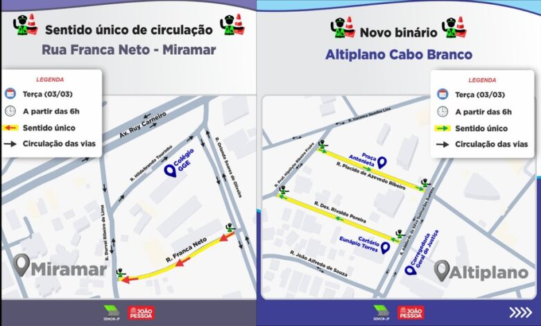 A Superintendência Executiva de Mobilidade Urbana de João Pessoa (Semob-JP) anunciou mudanças no tráfego de vias localizadas nos bairros Altiplano Cabo Branco e Miramar, em João Pessoa. As alterações passam a valer a partir das 6h desta terça-feira (3) e, segundo o órgão, têm como objetivo melhorar a segurança viária e a fluidez do trânsito nas áreas afetadas.